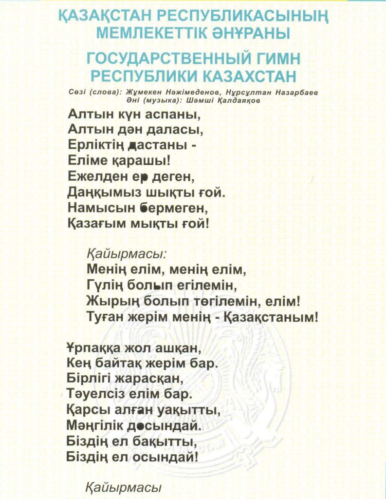 Бұрын «Менің Қазақстаным» әні ретінде танымал болған Қазақстанның әнұраны Президент Нұрсұлтан Назарбаевтың бастамасы бойынша 2006 жылы 6 қаңтарда еліміздің Парламентінде бекітілді. Бірінші рет ол 2006 жылы 11 қаңтарда Мемлекет басшысының салтанатты ұлықтау рәсімінде орындалды.Музыкасы – композитор Шәмші Қалдаяқовтікі, сөзі – Жұмекен Нәжімеденов пен Нұрсұлтан Назарбаевтікі.Әнұран – мемлекеттің басты рәміздерінің бірі.